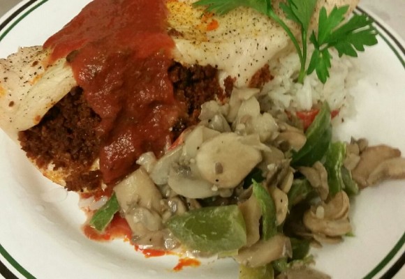 Tender chicken breasts stuffed with chorizo and melted cheese and topped with a red enchilada sauce. Served with a mushroom ragout over lemony rice.