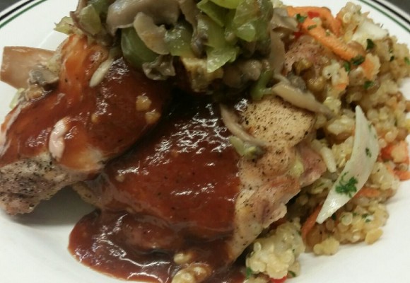 Marinated chicken thighs with a grape and walnut compote and a wheatberry and lentil side – great combination of flavors! (Contains walnuts)